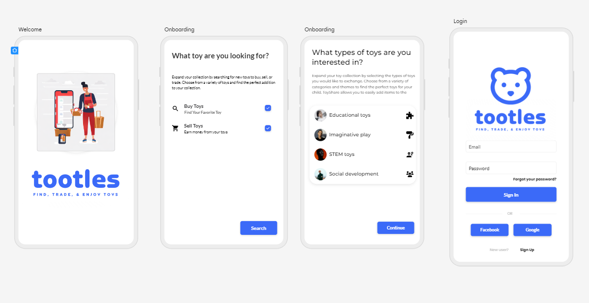 In this comprehensive case study, I will outline the step-by-step process of creating a mobile application called Tootles. The app aims to provide a safe and enjoyable platform for parents and guardians to exchange toys for their children, encouraging sustainable practices and fostering a sense of community. As the sole designer on this project, my objective was to deliver an intuitive, visually appealing, and user-centric app to enhance the toy-trading experience.