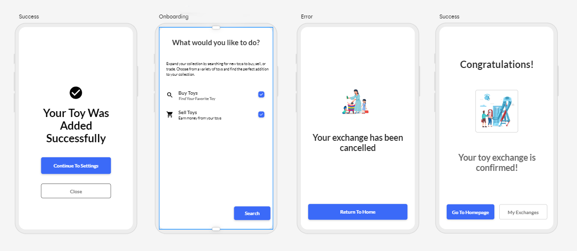 The Tootles app presents a user-centric and visually engaging platform for parents to exchange toys sustainably. Through thorough research, iterative design, and user testing, the app offers a safe, seamless, and enjoyable experience for users, aligning with the goal of fostering a vibrant toy-trading community. The final design successfully balances a child-friendly visual appeal with a professional layout, encouraging sustainable toy trading while providing parents with a sense of security and trust in the app.